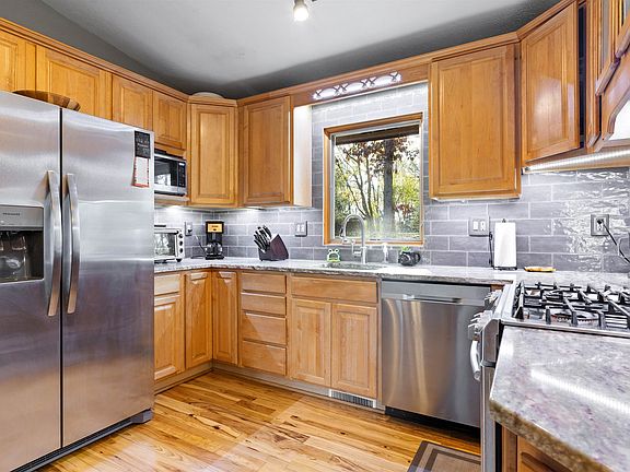 Fully exposed, walkout from finished lower level Ranch, sitting on a wooded lot full of mature trees. Want a heated workshop, extra garage or storage space, man cave, this home has both attached and detached garages for you. A wow kitchen, hickory hardwood flooring, stainless steel appliances, cabinetry with pullouts, granite countertops, gas cooktop, eating area. Living Room with gas fireplace, Hickory hardwood floors. Almost every window replaced, Pella windows. Family Room with vaulted ceiling. Decorator colors, professionally painted. Primary Bathroom is spa like, walk-in tile shower with 7 shower heads, tile floor, double vanity sink, granite countertop, newer lighting. 6 panel solid doors. Oak stairway leading down to professionally finished lower level. 2nd Family Room with fireplace, bar area, tin ceiling, tile floor, bedroom. Walk out to patio with 6 person Jacuzzi hot tub. Professionally landscaped almost an acre lot with a firepit.
