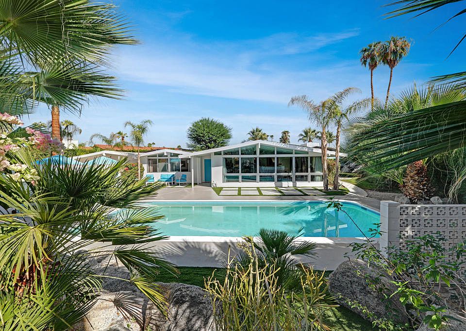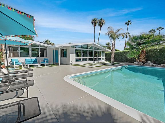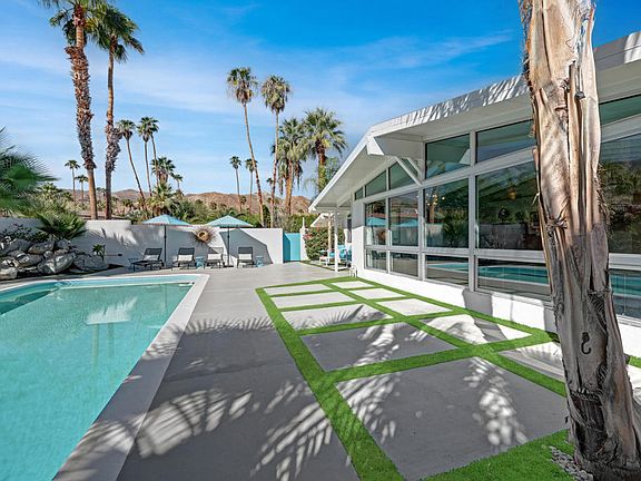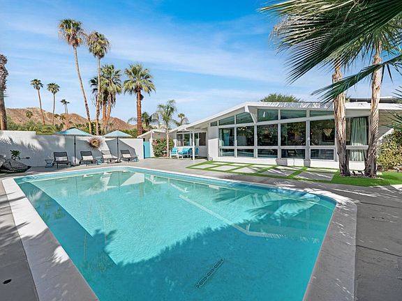 Newly improved and ready for move-in, this stunning 1956 example of Mid-Century Modern architecture has returned to the market in Rancho Mirage's Magnesia Falls Cove. Designed by the legendary Alexander Construction Company and built by television and radio star Art Linkletter, the model-caliber residence offers exceptional privacy, gorgeous mountain views, and an ideal mix of period-perfect and on-trend appointments. Approximately 2009 square feet with three bedrooms and two upgraded baths, the single-level design reveals the open, bright and seamless living spaces that continue to draw so many to MCM style. Its former ADU has been restored to an attached two-car garage with air-conditioning that can serve as a studio, gym, office and more. Floor-to-ceiling windows frame pool and mountain vistas in a spacious living room with stone fireplace and a dining room that opens to an intimate patio. Cut the commute by conducting business in a view-enhanced office at the front of the home, and embark on culinary adventures in an open kitchen that displays Caesarstone countertops, custom cabinetry, a full mosaic-tile backsplash, and stainless steel appliances including a wine refrigerator and five-burner range with double oven. Start and end each day in the privacy of a chic primary suite with generous proportions, an ensuite bath and ample closet space. Vaulted ceilings lend an airy vibe throughout, and tile flooring, new paint, custom lighting, OWNED solar system, dual-pane Solarban windows and a recently resealed roof are featured. A grand homesite extending approximately 13,068 square feet presents a walled and gated front yard with panoramic views, a swimming pool, custom rockscapes and turf-and-concrete patios for impressive entertaining. The backyard offers a private oasis with fragrant citrus trees and large lawns, and the driveway welcomes generous off-street parking. Residents of Magnesia Falls Cove appreciate its quiet ambiance, which belies a location that is remarkably convenient to shops, restaurants and theaters at The River, the opulent Sensei resort, renowned golf courses, and countless attractions in Palm Springs and Palm Desert.