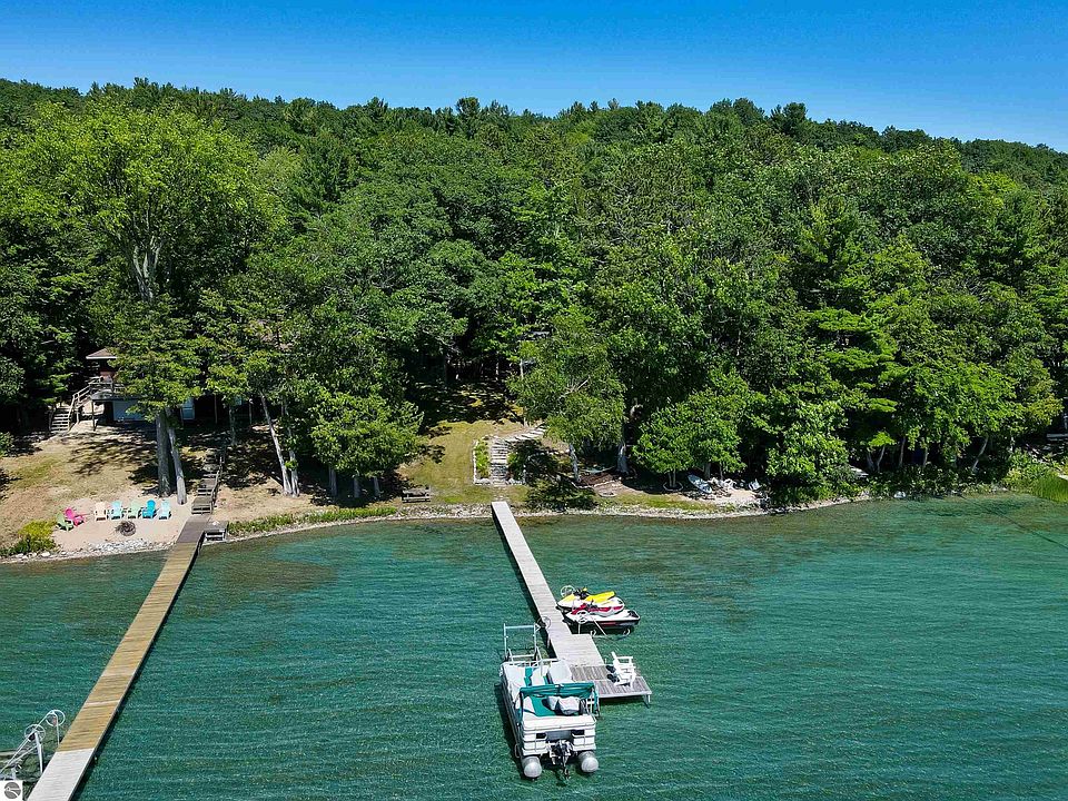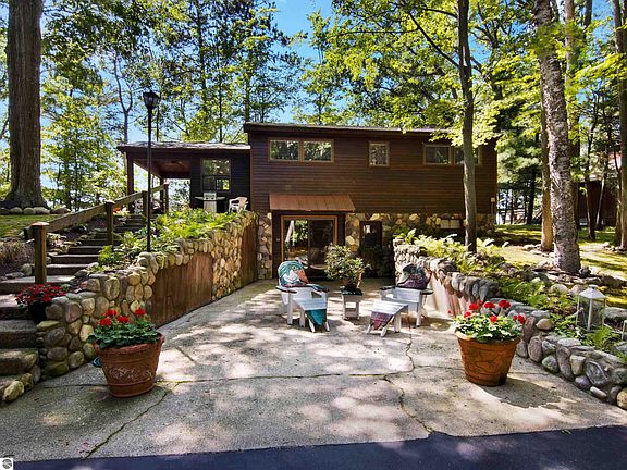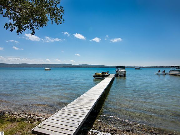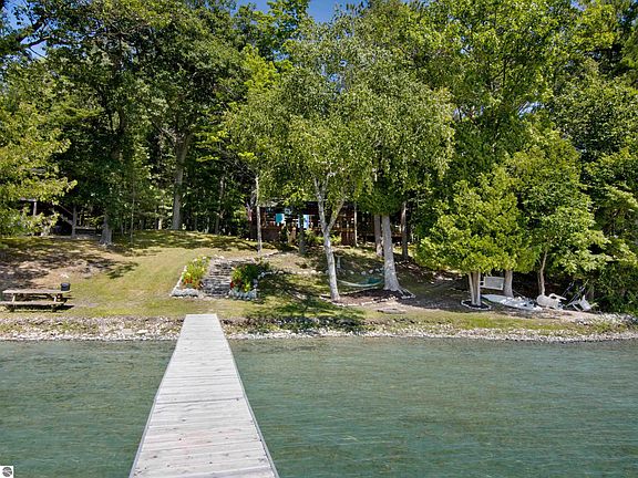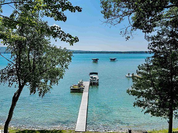 Private sandy beach waterfront on Big Platte Lake. Turn key 3 bedroom, 2 bath r home is turnkey including the toys for this summers fun on the lake. Big Platte lake is an all sports lake nestled next to the Sleeping Bear Dunes National Lakeshore Park. Home features a sunny waterside living room with lake views and a cozy stone surround fireplace. Main floor features hardwood floors throughout, an updated kitchen with granite counters and stainless appliances, 2 bedrooms and one bath. Large raised deck for outside living and also a covered porch to sit and enjoy the afternoon shade. Guests and grandkids love the full finished basement with a family room, sleeping area and large bath with laundry. Sandy frontage is great for the kids and a firepit for summer evenings. A large detached garage houses the toys and cars. Close to the Platte river to paddle to Lake Michigan. Near Frankfort, Beulah and Honor for shopping, golf and dining.