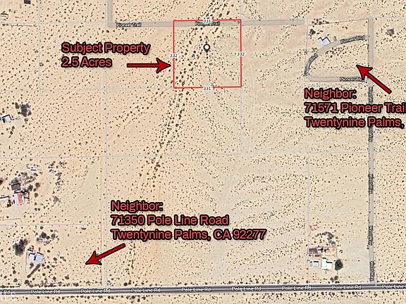 This tranquil 2.5-acre property (APN: 0633-291-08-0000) offers an impressive 331 feet of frontage on Pioneer Drive in 29 Palms, just off Pole Line Road and under 5 miles from the 29 Palms Highway (CA State Route 62). Nestled in the peaceful Desert Heights area, this lot provides breathtaking panoramic views and a sense of quiet solitude. With neighbors nearby, accessing utilities should be straightforward, making this the perfect canvas for your dream build.