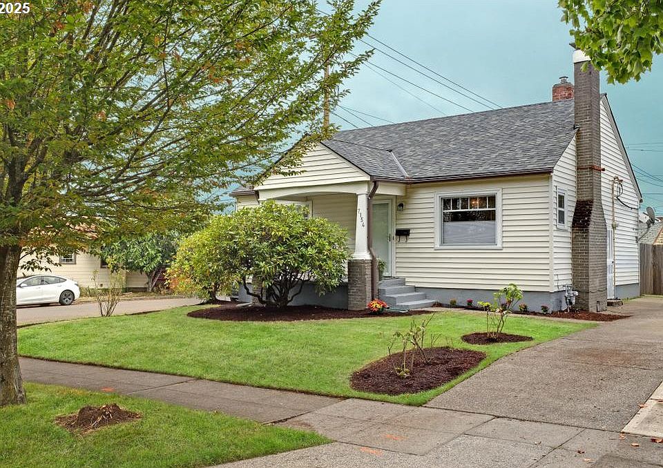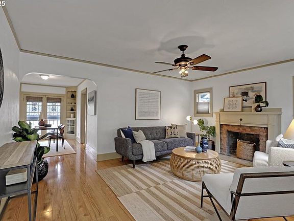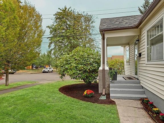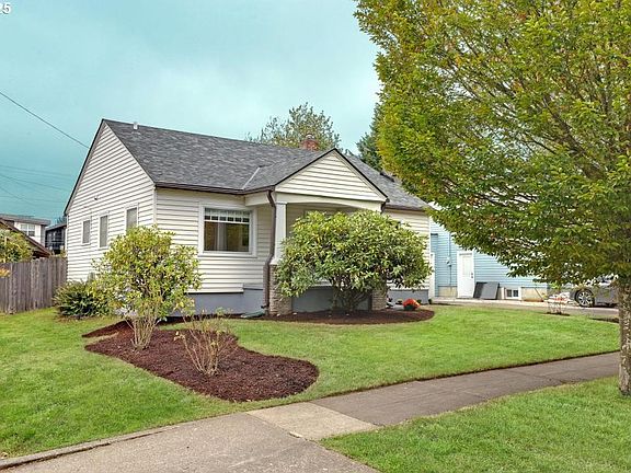Stylish and charming Arbor Lodge bungalow on quiet 5,000 SF corner lot with beautiful street trees, 360 SF detached garage and zoned RM1. Ideal main-level floor plan lives large and beautifully! Gorgeous engineered hardwood floors, new interior paint and tons of windows make this home feel light, airy and spacious. Sweet and private feeling covered front porch. Formal living room with huge picture window, front-entry coat closet and sexy wood-burning fireplace. Arched entrance into formal dining room with built-ins and French doors to huge fully fenced backyard. Large and lovely updated kitchen with breakfast nook, maple cabinets and stainless-steel appliances. Two good-sized bedrooms with deep closets, and a very cute bathroom in between. Unfinished lower level offers separate outside access from driveway, big laundry area with washer and dryer, storage galore, gas furnace and water heater. Home also has heavenly air-conditioning and it’s own driveway to conveniently park. Big, oversized 360 SF garage needs some door repair, but offers wonderful space on this sunny corner lot - potential ADU? Buyer to do due their own diligence on RM1 zoning, but options abound. Live here happily as is, or take this home to the next level and build or bank your own equity! Just minutes from New Seasons, Fred Meyer, wonderful transit, easy freeway access and dozens of popular cafes, restaurants and pubs. Please see carefully curated list of owner’s favorites hot spots. Walk Score of 83 and Bike Score of 99. Open both Saturday 10/11 and Sunday 10/12, from 1-3 pm. [Home Energy Score = 3. HES Report at https://rpt.greenbuildingregistry.com/hes/OR10242235]