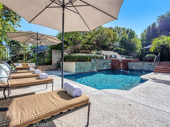 Truly spectacular West Hills pool home in the much sought after Castle Peak Estates and the Las Virgenes School District. Beautifully remodeled, this 4 bedroom, 3 bath sunlit home is the largest and most popular Castle Peak floor plan with almost 2900 sq ft of open living space. Enter this beautiful home through the custom glass front doors and step into the large foyer. You will be greeted with soaring ceilings, picture windows, custom fireplace that looks like a piece of artwork, travertine floors, recessed lighting and dual pane windows. The heart of the home is a spectacular grand kitchen featuring a 9 ft center island with prep sink, and separate dining space perfect for entertaining, granite counters, stainless appliances including a built in Dacor fridge, double oven, warming drawer, 5 burner-gas cooktop and pot filler. The kitchen seamlessly flows into the enormous family room with custom maple cabinetry, a second fireplace and powder room. Outdoors, enjoy resort-style living with pool, spa and 4 separate lounging and dining areas all surrounded by lush landscaping. Upstairs you will find the spacious primary retreat with custom built-in cabinets, large walk-in closet and primary bath with soaking tub. The three additional bedrooms and bathroom are all spacious in size. Additional highlights include a 3-car garage, light filled interiors, and premium finishes throughout with tons of storage. This home offers the ideal blend of modern comfort and entertainer's flair in an enviable school district.