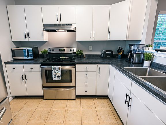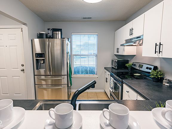 Open patioSpacious primary bedroomMature treesStainless steel appliancesPrivate fenced backyardWhite cabinetryDurable tile flooring