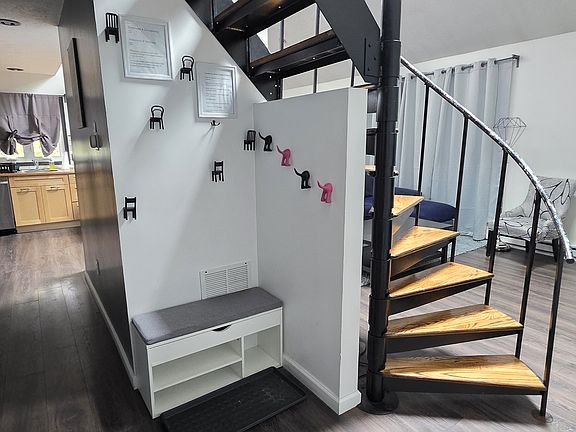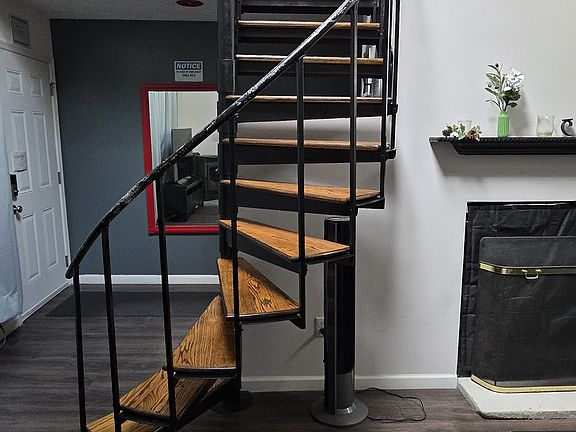 Cozy fireplaceAttached garageOff-street parkingElectric rangeCorner lotSpiral staircaseHuge deck