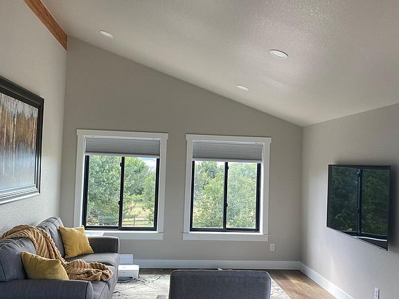 Living room includes couch and chair with flat screen smart TV. Large windows over looking the front range/mountains.