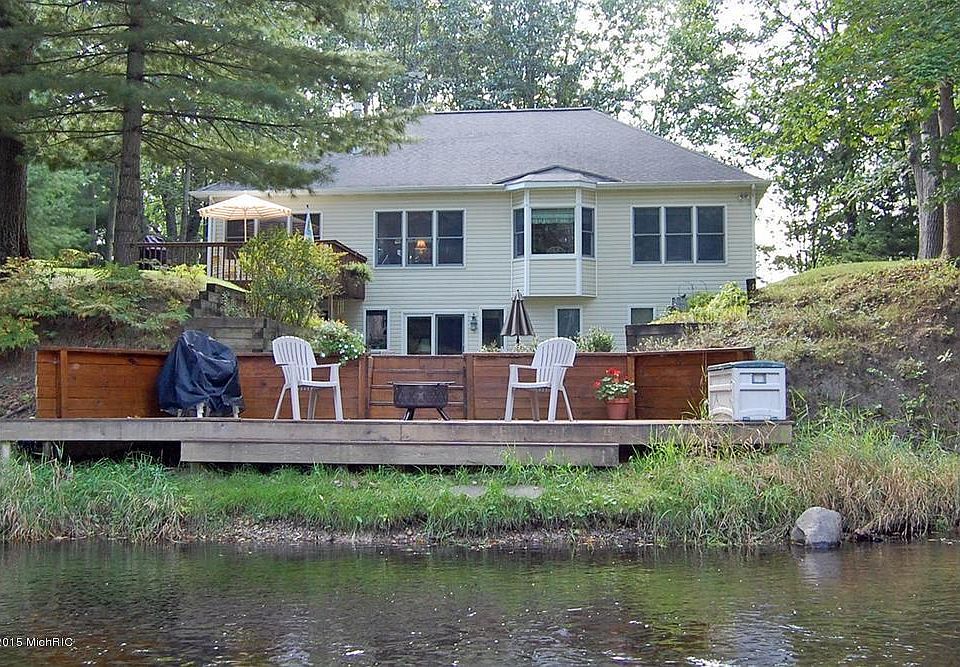 All the charm of an English Countryside cottage nestled on the banks of the Little Muskegon River. Elegantly designed chefs kitchen, sumptuous master suite, private office with fireplace and a separate entrance. Impeccably designed with a finished walkout lower level that doubles the living area of this spacious home. This private lower level includes two large bedrooms, a bunkroom, kitchenette, wonderful children's play area and ample storage. Main level split floor plan with large living ro om area has universal appeal. The manicured lawn and grounds are shaded and secluded with great views of the river. This home would be an excellent choice for fulltime residence or summer enjoyment. Please schedule your tour soon!