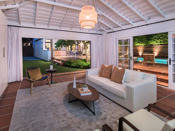 Charming storybook Spanish w/impressive curb appeal on an oversized lot in prime El Medio Bluffs. All the character of an original 1920's Spanish(i.e.2-story entry, wood beamed ceilings, arched hallways, terra cotta roof tiles, handcrafted tile & iron work), yet recently built w/modern amenities (ie. open floor plan, high ceilings, modern kitchen, surround sound, walk-in closets etc.). 3 Large bedrooms + 3 baths & a laundry room up. Downstairs formal dining & living/play room, a bedroom/office, powder room, a light filled eat-in kitchen w/butler's pantry open to the spacious family room w/fireplace, all spilling out to the backyard oasis. A new large swimmers pool w/automatic cover, grass area, children's sports court, al-fresco dining, fire pit w/lounge & a 2-room casita w/an Ojai Valley Inn type feel. Located in prime Pacific Palisades on a picturesque tree-lined street w/wide sidewalks, less than a mile from the new (Caruso) Palisades Village & just 5 min from the beach.