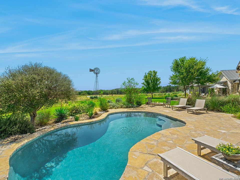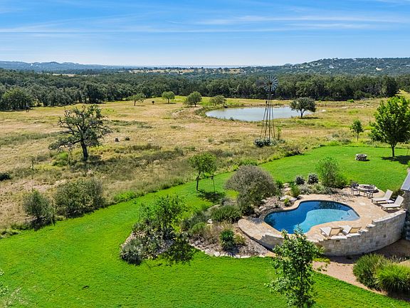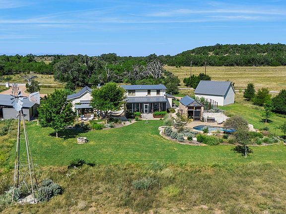 Step into a rare piece of Fredericksburg history, thoughtfully reimagined for modern living. Originally built in the 1890s by German settlers, this pioneer homestead at 716 Arbor Ridge showcases timeless masonry and authentic craftsmanship that honor its roots. The original stone barn still stands, now transformed into a screened garden room overlooking the sparkling pool, while the main limestone and wood-frame home has been meticulously expanded within the last three years by Eric Mustard Architects of Fredericksburg and M-Interiors of San Antonio. Today, it offers four bedrooms, three baths, and approximately 2,500 square feet of refined interiors, with original wood floors and stone walls beautifully preserved-adding warmth, character, and a tangible connection to the artisanship of a bygone era. Interior highlights include a modern chef's kitchen with custom cabinetry, stainless appliances, a gas range, and solid countertops. The vaulted primary suite retreat features a spa-like marble shower, whirlpool bath, and custom California Closet walk-in, complemented by a rich mahogany-paneled office. Authentic farmhouse living and dining areas with a fireplace and shiplap walls provide inviting gathering spaces, while an old root cellar has been converted into an extraordinary wine room. From hand-hewn stone walls to soaring ceilings and screened porches, every corner of the home seamlessly balances old-world character with modern luxury. Set on 25 rolling acres in the heart of Texas Hill Country, this retreat is as much about lifestyle as it is about architecture. Outdoor amenities include a sparkling pool, expansive flagstone patios, a rock fire pit, multiple screened porches, and a deer-proof garden with raised beds-all enhanced by landscape design from Oro Design Group of Austin. The grounds are further distinguished by two lined and aerated ponds stocked with bait fish, two water wells (including the original hand-dug limestone well), wildlife feeders, and an iconic windmill. A detached two-car garage with additional storage pairs with an oversized carport designed to house a Prevost bus, RV, or ranch vehicles, while concrete bunkers with a workshop area and a Generac generator provide added security. With its blend of historic integrity, thoughtful design, and rare acreage just minutes from Fredericksburg, this estate offers an extraordinary opportunity to own a piece of Texas heritage while enjoying the finest comforts of today.