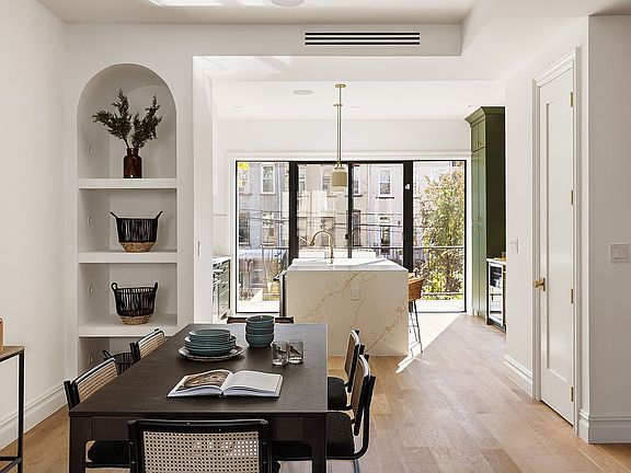 Duplex with Finished Cellar: The main residence opens to a striking foyer with an oversized half-glass door, setting the tone for the elegance beyond. The parlor level boasts 10-foot ceilings that fill the space with light. The open living and dining area features custom built-ins and intricate molding, while the kitchen dazzles with a large island, custom cabinetry, quartz countertops, a farmhouse sink, a suite of Thermadore appliances, a microwave drawer, and a wine fridge. From the kitchen, full-glass double doors open to the parlor deck, offering serene views of the garden below.