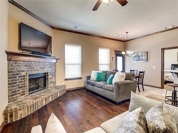 Ready for move-in, highly-maintained, built 2012, 1930 square foot brick home in the Chisholm Crossing Addition. This home features 3 bedrooms with optional 4th or study, 2 baths and 3 car attached garage, living room with corner brick fireplace and wood flooring. Kitchen offers a breakfast bar, culinary faucet, built-in microwave, dishwasher, garbage disposal, stainless steel appliances and ample pantry storage. Lots of closets, storage and master suite which offers a relaxing jetted tub, glass walk-in shower, dual sink vanity and walk-in closet. Home has inside utility room with storage space. Bedrooms and living room feature ceiling fans. House has fenced yard with front and back covered patios and fire pit with cobblestone pad out back. Desirable Yukon Schools. Close to I40 and Kilpatrick Turnpike. Cable ready, vaulted ceilings, Double Pane/Storm Windows, central heat and air. Garage Door Lift, Security System, Smoke Alarm and STORM SHELTER. DO NOT DISTURB CURRENT RESIDENT. Available, July 1, 2025, 12 month minimum lease; Deposit $1,950.00. Directions: From I-40, Take exit 138-139 for OK-4 toward Mustang/Yukon, Keep right at the fork, follow signs for OK-4 N and merge onto OK-4 N/N Mustang Rd, Turn right onto NW 6th St, Turn left onto Dusty Trail, Destination will be on the right. For further details or to set an appointment to view the home call, text or email.