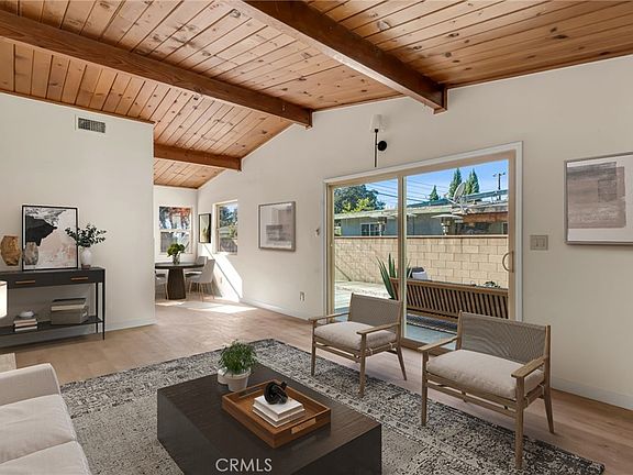 Inside, you’re greeted by stunning vaulted wood-beam ceilings that create an airy and open feel. The spacious living room features large sliding doors that frame the private backyard and fill the space with sunlight. Just off the living area, the dining nook enjoys views of the yard and effortless access to the kitchen, making entertaining a breeze.