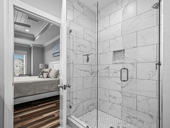 Granite countertopsTiled bathroom floorsWood-look vinyl planksWalk in showers