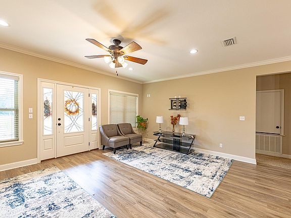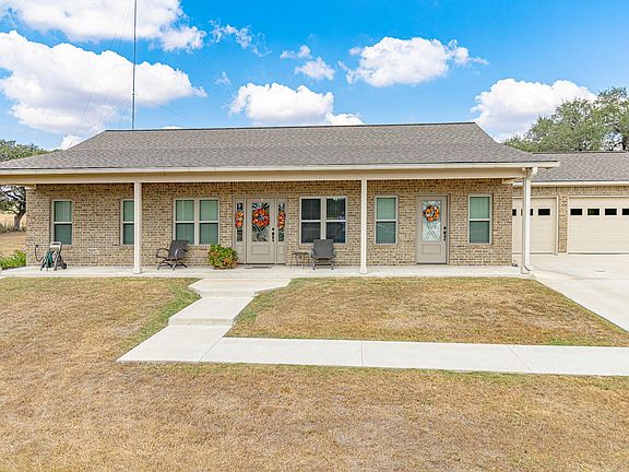 Beautiful 3-bedroom, 2-bath custom country home on 5.875 acres just west of Yoakum. Built in 2020, this modern home offers open-concept living with a split-bedroom design. The kitchen and baths feature custom cabinetry and solid-surface countertops. The master suite includes a walk-in closet, step-in shower, single vanity, and private access to the front porch—perfect for relaxing and watching wildlife. The additional bedrooms are spacious with deep closets. The large utility room includes a sink, custom cabinets, and space for a washer, dryer, and freezer, with access to the two-car garage featuring automatic doors and natural light. Enjoy peaceful mornings and evenings on the large front and back porches. The property is dotted with mature oak trees and abundant wildlife, including deer and turkeys. Additionally, the property has a 50amp plug for RV parking and a storage building that doubles as a well house and green house.