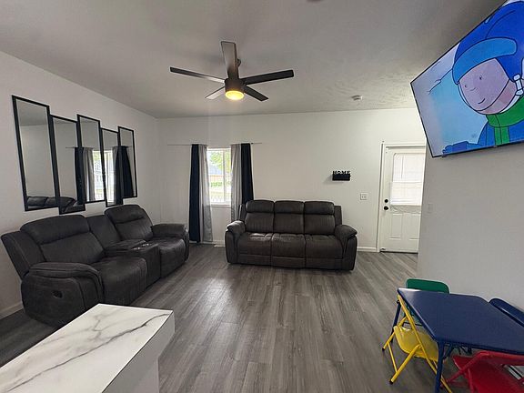 Open floor planOutdoor deckLaundry spaceSitting areaFour generously sized bedroomsKitchen and dining roomSliding patio door