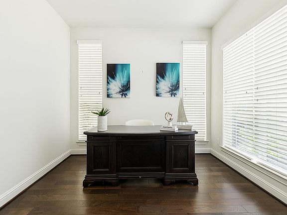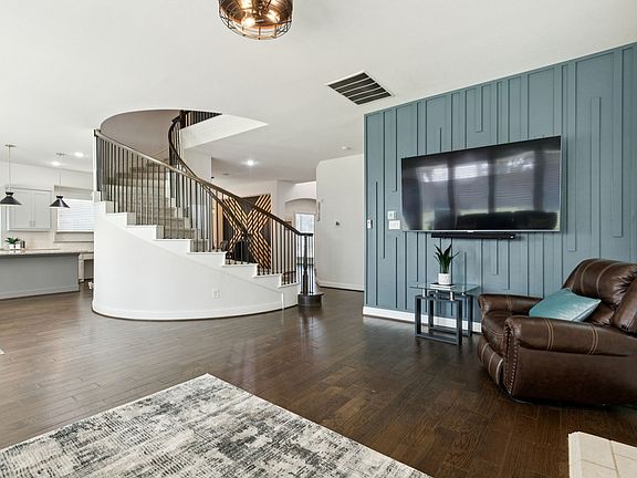 Welcome to this beautifully designed two-story home nestled on a spacious lot with mature trees and impressive curb appeal. A charming covered front porch welcomes you inside, where style and functionality blend effortlessly throughout. Step into the grand entryway featuring luxury vinyl plank flooring and a striking wrought iron spiral staircase that sets the tone for the home’s timeless elegance. The open floor plan offers a formal dining room with direct access to the kitchen, ideal for entertaining. A private office provides the perfect space to work from home, while paneling accent walls add warmth and character throughout. The light-filled family room boasts a cozy fireplace and is surrounded by tons of windows that flood the space with natural sunlight. The heart of the home is the spacious kitchen, complete with granite countertops, a large island, stainless steel appliances, a gas cooktop, and abundant cabinet space. Enjoy casual meals in the bright eat-in dining area overlooking the backyard. Upstairs, plush carpet leads you to a versatile flex space—perfect for a media room, playroom, or second living area. All 4 bedrooms are upstairs as well as 3 full bathrooms, one of them being a jack-n-jill. The extra-large master suite is a true retreat featuring dual vanities, a large soaking tub, and ample closet space. Outdoors, enjoy year-round relaxation on the covered back patio overlooking a large, grassy backyard—ideal for kids, pets, or weekend gatherings. A double-door garage adds both convenience and storage. Located in a vibrant community offering resort-style amenities, including a pool, splash pad, clubhouse, playground, trails, pavilion, and more!