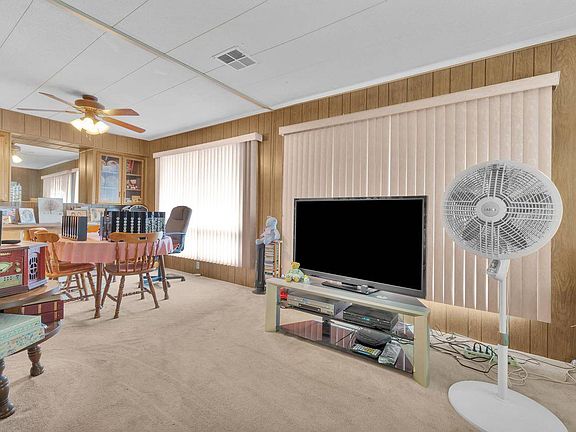 Welcome home to this beautifully maintained and spacious 2 BR, 2 BA home located on a desirable corner lot in a friendly, well-kept, 55/18 community. Inside, you'll find a large living room and a comfortable family room, perfect for relaxing. The formal dining room includes a charming built-in hutch and connects to a well equipped kitchen featuring a double wall oven, cooktop and dishwasher-plus plenty of storage and a breakfast bar. The dual access guest bath offers , a step-in shower with a handicap bar and easy accessibility. The laundry area includes the washer/dryer. The primary bedroom is generously sized, featuring wall-to-wall mirrored closets and private bath with a large vanity area and shower/tub combo. Additional highlights include a California room, some newer windows, 3 ceiling fans, two storage sheds, a handicap ramp, and a carport with louvers that will park up to three cars. Best of all, No property taxes! (ABE4500)