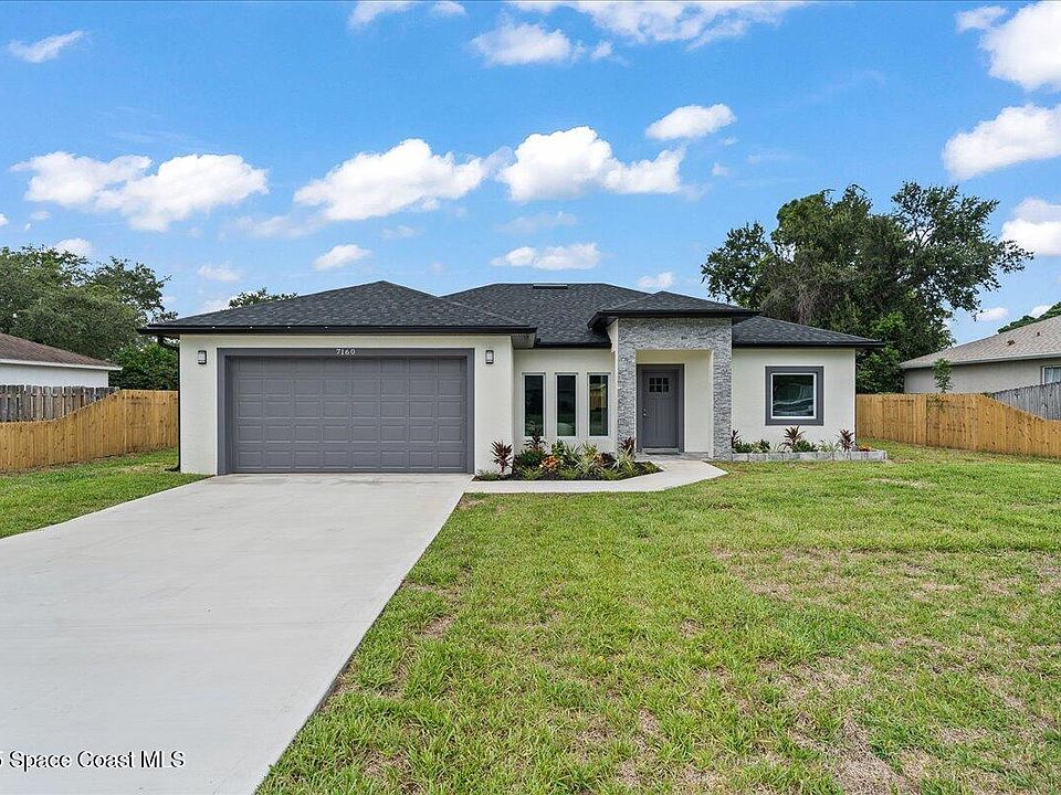 Beautiful new home with stone accents, featuring 4 bedrooms, 2.5 baths, and a 2-car garage on a spacious A¼-acre lot. Enjoy open-concept living with tile flooring throughout, a modern kitchen with wood soft-close cabinets, quartz countertops, backsplash, stainless steel appliances, and a large island overlooking the living room. The dining area and primary bedroom each have sliding doors leading to a tiled rear lanai and fenced backyard. The primary suite includes his-and-her closets, a dual-sink quartz vanity, and a large walk-in shower. On the opposite side of the home, you'll find three bedrooms and 1.5 baths. Built with hurricane-rated windows and sliders, this home offers peace of mind, comfort, and style. No HOA and just minutes from schools, shopping, and a short drive to Orlando.