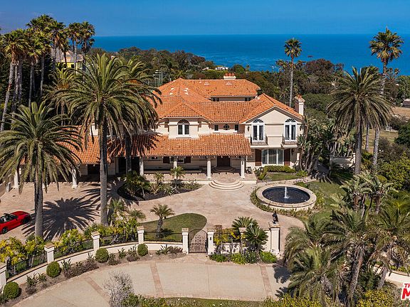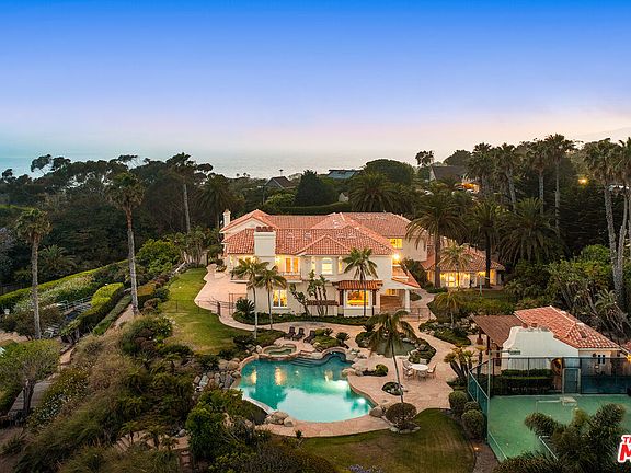 This Idyllic Mediterranean Estate on 2+ Acres at the heart of Point Dume with 180* Promontory Ocean and Point views combines traditional sophistication, warmth, and timeless European design in a private and peaceful So Cal setting. World class amenities include Gated Entry, Resort Lagoon pool with hot tub & water feature, tennis/sport court w/ equipment room, pool house w/outdoor kitchen, dining, bar, living area w/ fireplace, gated motor court with multiple parking spaces & guest parking, detached one bedroom guest house, and a wine cellar. This offering includes a 74,512 Sq Ft. main lot + an additional smaller 14,348 Sq. Ft. lot that connect to each other at the lower sports field where kids have the freedom to run and play or to accommodate larger events. At approximately 10,000 Sq Ft. the main residence features Public Rooms on the first floor and Private Family living on the second floor. Access the second level from one of two staircases to find an incredible Primary Suite featuring Coastline, Ocean, and Horizon Views, bath with steam shower, jetted tub, dual sinks and water closets, and dressing room. Completing this level are 3 additional bedroom suites with full ensuite bathrooms, a dance/yoga studio, and an executive office. On the first floor, rooms are expansive and the floor plan is thoughtfully set and positioned toward the views. The Great Room faces the Pool and a children's play area. Its features include eat-in dining, wet bar, wood burning fireplace, and breathtaking Point Dume & Ocean Views. At the heart of the home is a Gourmet Kitchen with breakfast nook and counter dining, full suite appliances, dual refrigerators, custom Scandinavian cabinets, and pantry and service areas both of which are nearby the formal and casual dining. Completing the lower level is an entertainment room with pool table and fireplace as well as full Maid's Quarters w/ ensuite bath & service entrance. This seasoned home is strategically positioned on this exceptional lot to take full advantage of Malibu's impressive Sunsets and coastal breezes. Move right in and enjoy, or take advantage of the current size of the home and its' layout to cosmetically update and personalize to make it your own. Text agent for a quick reply.