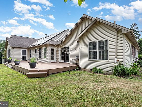 This oversized 4 bedroom 3.5 bath ranch home with 3 car garage on landscaped 2+ acres private lot is waiting for you and your family. Wonderful quiet location. Open floor plan, hardwood floors, pleasant kitchen & dining area. Great room with gas fireplace. The bedrooms are all nice sized. Solar panels for electric, huge composite deck overlooking the very private backyard. Thousands in updates! This one extraordinary home at a great price & in a desirable location. Some of its many features include: New in 2024 high efficiency heating and air conditioning system, Newer hot water heater, invisible dog fence around perimeter of property. Silestone quartz counter tops, and a Smart thermostat.