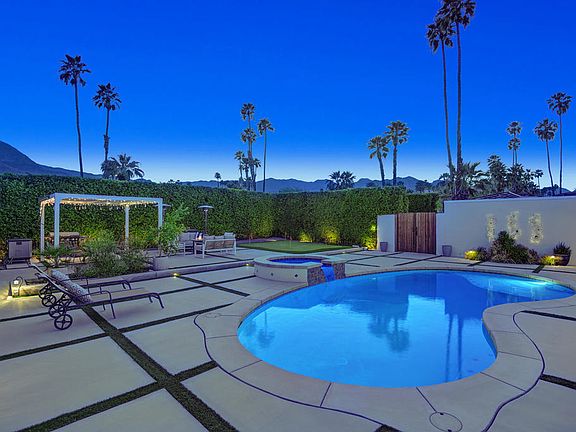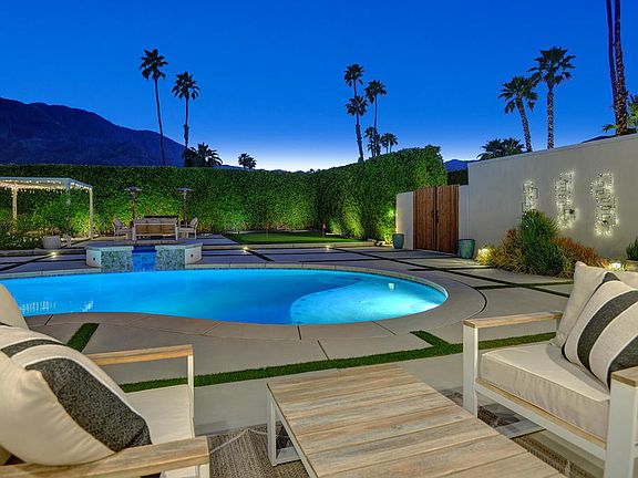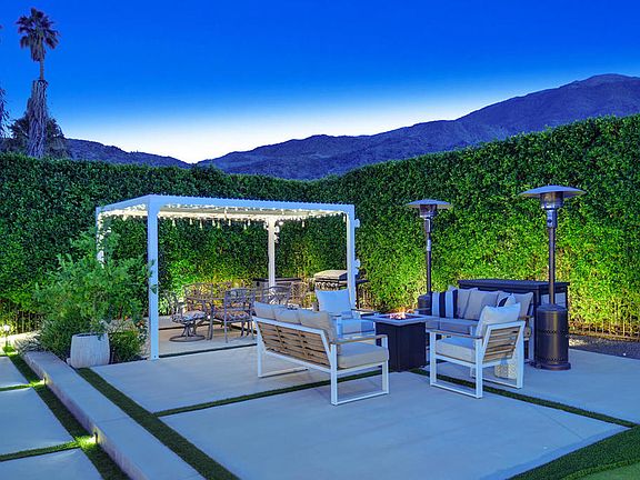 Welcome to your dream retreat, perched high above Rancho Mirage in the enclave of Magnesia Falls Cove situated on nearly 1/4 Acre lot, where panoramic mountain views, total privacy, & curated luxury come together in a showstopping desert escape. This fully furnished residence underwent a meticulous interior & exterior renovation completed in 2020, including roof, all major systems & a 32-panel owned solar system paired with a state-of-the-art LG backup battery - offering both sustainability & savings without compromising comfort. Step through the gates into your own private resort, where the lush, front-loaded patio commands awe-inspiring, unobstructed mountain views that feel like your own. This outdoor haven with southern exposure is designed for serene relaxation and entertainment, featuring a sparkling gemstone pebble saltwater pool & spa, firepit, louvered & lighted pergola, putting green, & landscape lighting that transforms the space into a magical evening escape. Inside, nearly 3,000 sq ft of airy sophistication awaits. With 4 en-suite bedrooms, this home is one of the largest in the community. Every inch reflects thoughtful design: from the porcelain wood-look floors, to the soaring vaulted tongue-and-groove ceilings, to the abundance of natural light that enhances the warm, neutral palette. At the heart of the home is a chef's dream kitchen: modern cabinetry, gleaming Quartz countertops, premium KitchenAid appliances including double ovens, commercial-grade stove, warming drawer, pot filler, & massive island with dual farmhouse sinks & undercounter storage. A built-in bar with wine fridge adds the finishing touch to this entertainer's paradise. Great flow from the elegant dining area that easily accommodates ten, to the open family room with a double-sided fireplace, to the game-ready living room featuring 16-foot sliders that bring the mountain views in. The primary suite is a sanctuary all its own, with direct pool/spa access & mountain views, a spa-style bath featuring a 10-jet therapeutic tub, roll-in shower, & a cedar-lined walk-in closet. All of this just moments from the best of Rancho Mirage. Walk to The River Mall for shopping, dining, & entertainment, or explore nearby golf courses, hiking trails, & the iconic El Paseo shopping district. Sold fully furnished per Seller's inventory list, this exceptional home is ready to elevate your lifestyle from the moment you arrive.