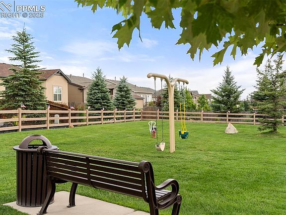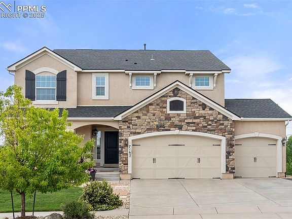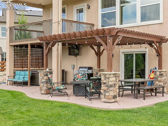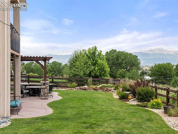 This stunning two-story stucco home offers unparalleled access to the highly sought-after Sand Creek Trail, boasting unobstructed mountain views and much like a builders model offers a wide array of desirable upgrades. The main level is designed for both comfort and entertaining, featuring a private office, elegant dining room, a breakfast area, and convenient bar seating. The spacious living room is anchored by a gas fireplace with a sophisticated stone facade. This level also includes a half bath, and opens onto a deck that provides a full panorama of Pikes Peak and the front range, all within an inviting open floor plan. The truly picturesque kitchen is a chef's delight, offering abundant cabinet space, gleaming granite countertops, a gas range, double ovens, and walk-in pantry,. Upstairs, the luxurious primary suite awaits, complete with its own gas fireplace, a separate vanity area, an expansive walk-in closet, and an oversized walk-in shower that offers a spa-like experience. This level also features a versatile loft area, three additional well-appointed bedrooms, another large full bath, and an oversized laundry room for added convenience. The walk-out basement is an entertainer's dream, showcasing a dedicated movie room, a stylish wet bar, and a comfortable family room. It opens directly to a large patio with a pergola and a built-in privacy area, and pre-wired for a hot tub. The basement further includes an additional bedroom, a full bath, and ample storage space. The generously sized backyard is perfect for games, entertaining, fully fenced with a gate on each side and walkwy from both gates, and much more, benefiting from direct access to the Sand Creek Trail and no back neighbors. This exceptional home is ideally located across the street from a park, with easy access to shopping, dining, military bases, hospitals, walking trails, and a wealth of other conveniences.