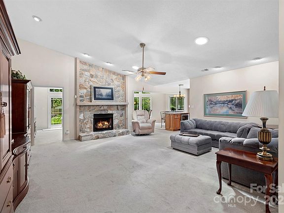 The vaulted living room features a fireplace and great flow into the oversized sunroom, which