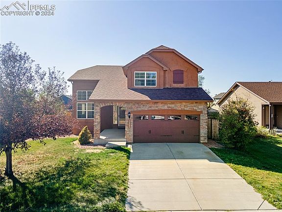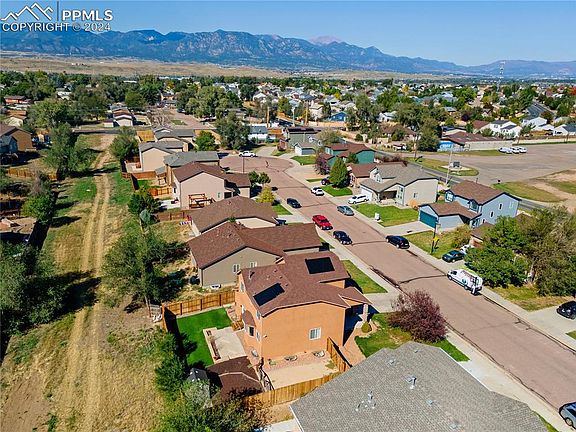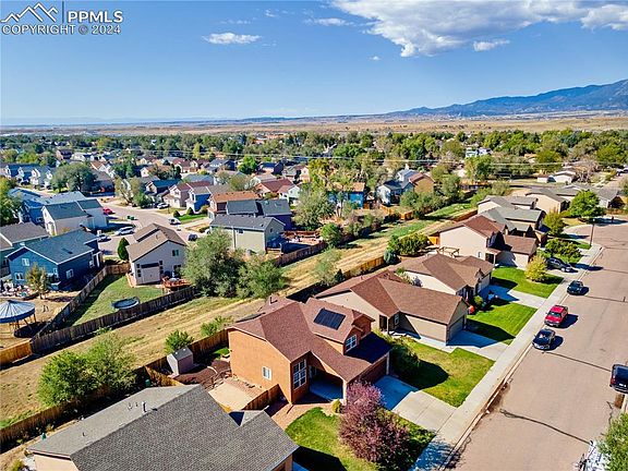 Meticulously maintained inside and out in the back yard.. minutes from Ft. Carson and Shopping. With 4 bedrooms & 3.5 baths and two flex spaces in the basement this home is in such great condition. The well-manicured front lawn and a beautiful decorative stone archway entering the home and the spacious covered front porch and open entry give this home excellent curb appeal. This home includes an oversized eat in kitchen that leads into the dining room with vaulted ceilings, main level gas fireplace, main level laundry, a movie theater room with surround sound Yamaha speakers in a finished basement completed in 2021, upgraded lighting throughout, class 4 roof, central air conditioning, a radon mitigation system, are just some of the many features of this amazing home. The kitchen has quartz counter tops, and a large kitchen pantry. The backyard is maintenance free with artificial turf, kid friendly rubber mulch, a sizable concrete patio, a storage shed and dog run area. The oversized Primary suite has lots of room for a sitting area, an attached bathroom with double sinks and a large walk-in closet. The living room is very open with a custom mantle and a relaxing fireplace to get cozy during the Colorado winter days. This home is a close commute to Fort Carson, close to shopping and so much more. This home has solar that nearly negates the utility bill. Upstairs is the primary Bedroom and two spare beds that share a bath. In the basement is another oversized spare bedroom and bathroom with a flex/office space and separate 2nd family/media room with movie screen and surround sound speakers. Also in the basement is a large storage room under the stairs.
