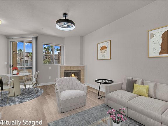 Welcome to this beautifully upgraded 2-bedroom, 2-bath condo in a desirable gated community! This 943 sq. ft. second-floor home features brand-new kitchen appliances, fresh paint, new wood laminate flooring, updated hardware, stylish ceiling fans, a modern countertop, and refreshed vanity. The open floor plan separates the primary suite, offering two closets and a linen cabinet, from the spacious second bedroom with a walk-in closet. Relax by the fireplace or on your private balcony. Just 3 minutes to Durango Casino, 15 minutes to the airport, and 18 minutes to the Strip, this location is unbeatable—plus you’re within walking distance to shops, dining, and essentials. Enjoy resort-style amenities including three pools, spas, tennis courts, saunas, fitness center, and multiple workout areas. Move-in ready at a competitive price, this home is perfect for first-time buyers, investors, or anyone seeking low-maintenance living with resort-style comfort!