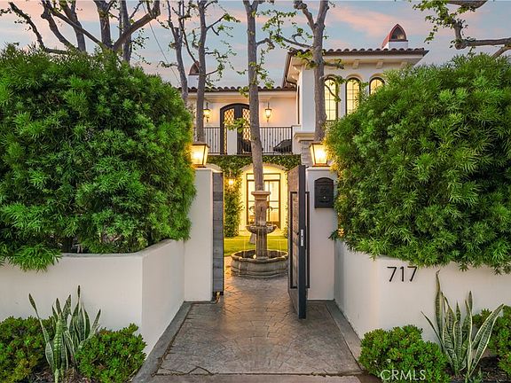 Nestled behind a custom wood gate and high hedges with a spacious, lushly landscaped front yard marked by soaring trees for added shade and privacy, this 4-bedroom, 6-bath, Santa Barbara-style residence features archways draped in jasmine vines and a wrought iron balcony, fusing Old World refinement and a fresh contemporary aesthetic that sets the tone for a high-touch interior featuring coffered ceilings, wood floors, refined fireplaces, neutral hues and Carrera marble throughout.