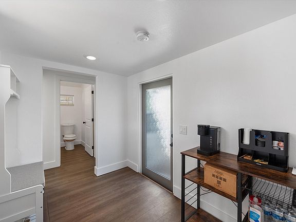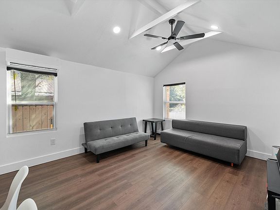Privacy fenceAttached carportSplit floor planVaulted ceilingsGutters lining the roof