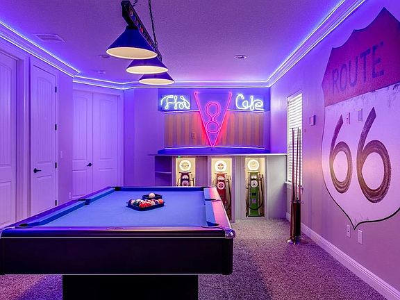 Income producing with strong history of rental bookings that convey to new owner! A truly one of a kind property! Take a journey down Route 66 and visit Flo's Cafe, unleash your inner super hero via tunnel slide, emerse yourself in the land of princesses or watch your favorite movies and play arcade games in the ultimate Star Wars themed theater/game room. This turn key property is not only an excellent investment opportunity but also can serve as a dream vacation home for friends and family to visit. Spanning over 4,000sf with 5 bedrooms, 5 full bathrooms and 1 half bath - including 2 luxurious primary suites (first and second floor), you'll find luxury, fun and relaxation throughout. The refreshing pool and spa overlooking the golf course and conservation areas provide entertainment, privacy and tranquility. Reunion is the area's premier golf and vacation community featuring 3 golf courses, tennis courts, water park, multiple restaurants, spa, mini-golf, shuttle services and so much more. A transferrable golf membership is included with this property as well. Make your appointment to view today!