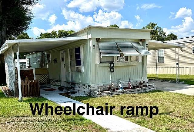 You'll love this immaculate 2-bedroom, 1-bath home in the popular 55+ community of Fountainview Estates. CASH SALE ONLY. LOT RENT $589/month and just a half block from Lake Gibson, Clubhouse, swimming pool, boat ramp, boat dock, and shuffleboard! The roof has been updated over the last year and is well-maintained. This home is updated with sparkling white cabinets, laminate flooring, and a microwave mounted above the smooth-top stove, leaving you more usable counterspace. All furniture, dishes, silverware, and bedding are included, making it completely move-in ready. Also included is an air fryer, coffee pot, and 2 TVs with antennas. The bath has a convenient walk-in shower. The hallway has additional closets and/or cupboard space. The primary bedroom is updated with 3 closets, laminate flooring, lots of windows for natural light, a beautiful new bed frame, a built-in dresser, and a mirror! The second bedroom is carpeted with built-in vanity/dresser drawers, which could even be a perfect office space or craft room! The living room is large, measuring approximately 14.5' x 11.5' with a bow window out front. The shed is larger, 12 x 8, and includes a washer and dryer, less than 1 year old, and lots of storage or workspace. All blinds and lovely curtains stay. What you see is what you get on this one! The carport is a delightful outside living space to enjoy the lake breezes and fresh air. Also, a covered porch on the other side of the house is convenient for additional outside seating. Pet-friendly 55+ community allows two pets at 25lb max. Enjoy Bass fishing, water skiing, and viewing beautiful sunsets from the clubhouse/dock. Utilities not included in lot rent. Owners pay electric, water, cable, and $25/year HOA. Heated Pool, Shuffleboard, Clubhouse with a kitchen, pool table, fireplace, library, puzzle box, and bingo. Great amenities with an affordable rent. The park is approximately one hour from beaches to the West, and Legoland and Disney World to the East. Fountainview Estates is situated near an abundance of shopping, restaurants, and medical services...most accessible by golf cart! Good news given today's gas prices. PARK APPROVAL IS REQUIRED with proof of income at least 3 times the monthly rent. MUST BE AT LEAST 55 years old to apply. Application fee is $50 cash per person (Canadian $85/ea.) Primary resident must be at least 55 y/o, and 2nd must be at least 40 y/o. Must HAVE a credit history with no collections. Background checks. THIS IS A MOBILE HOME IN A PARK ON LEASED LAND, NOT REAL ESTATE. YOU MUST CONTACT THE MOBILE HOME LISTING AGENT FOR SHOWINGS. All listing information is deemed reliable but not guaranteed and should be independently verified through personal inspection by appropriate professionals. Our company does not and cannot guarantee or warrant the accuracy of this information or the condition of this property. Measurements are approximate. The buyer assumes full responsibility for obtaining all current rates of lot rent, fees, and pass-on costs. Additionally, the buyer is responsible for obtaining all rules, regulations, pet policies, etc., associated with the community, park, or home from the community/park manager. Our company is not responsible for quoting said fees or policies. Sales price doesn't include tax, dealer, or admin fee.
