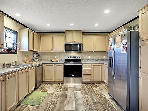 This 2022 modular home sits on 1.6 peaceful acres and offers 3 bedrooms, 2 baths, and 1,792 square feet of comfortable living space. It's all electric, comes with all appliances, and includes a bonus room that could be used as an office or playroom. The primary suite features a walk-in closet, double sinks, a walk-in shower, and a soaking tub. The laundry area has a large pantry for extra storage, and the home is handicap accessible. You'll love being right across from the Big Blue River - perfect for fishing or kayaking in the warmer months. City water and sewer, a red storage shed, and no floodplain complete this great property!