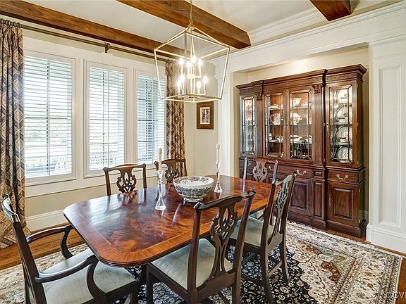 Outstanding custom French country home in Kinloch with seasonal views of Kinloch Lake across the street. Situated on a private lot with a wooded buffer on the corner, the setting is tranquil with lush landscaping and gardens to enjoy year round. Built as a builder's personal home, it features 10' ceilings on the first floor, wide-plank hickory floors, tall windows, 8' mahogany doors, exceptional moldings, new light fixtures, LED recessed lights, new ceiling fans, custom closets, new Hunter Douglas window blinds, and a two-way stone fireplace between the kitchen and family room. Spacious foyer and gorgeous dining room with exposed beams, a family room with vaulted ceiling and a renovated kitchen with a Wolf 6-burner range top. Kitchen updates include quartz countertops, backsplash, farm sink, faucets, light fixtures, Wolf vent hood, Kitchen Aid wall oven, microwave, refrigerator and GE Monogram dishwasher. New butler's pantry with coffee bar, cabinets and granite tops. The stunning vaulted ceiling porch has a stone surround gas fireplace, Phantom screens and 72" designer fan. The first floor primary suite has new countertops, sink, faucets and mirrors, shower light and fan plus a new custom closet system. The first floor guest suite has a vaulted ceiling and a private bath with new vanity top, sink faucets and upgraded shower head, floor, lights and fan. Second floor guest suite with sitting room and renovated bath. Two more bedrooms with custom closets, private baths with new granite tops, sinks and faucets. Second floor office with new bookcases and granite tops, exercise room and walk-in attic. Entertainment room with upgraded home theatre, wet bar with new quartz tops, farm sink, cabinets, refrigerator and ice maker. Two-car garage and a full size garage for golf carts. Newer HVAC with humidifiers, oversized leaf guard gutters. Optional Kinloch Lake Association for $100/year. Next to Kinloch Golf Club and Hermitage Country Club. Great fishing and kayaking on Kinloch Lake. 10 minutes to Wegmans.