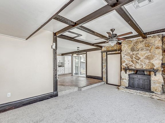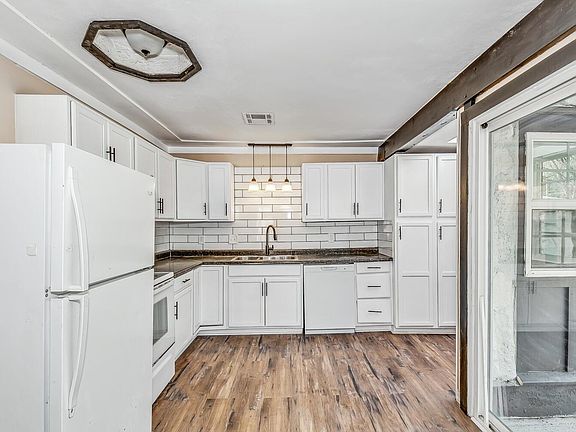 Located in the quaint town of Halstead, this 3 bedroom, 2 full bath home is move-in ready! This property features modern updates with the architectural flair of stone in much of the interior. The spacious kitchen/dining area has been completely updated with newer flooring, white cabinetry and subway backsplash. The living room has a stone wood burning fire place and exposed beams for even more character. Down the hall are two spacious bedrooms and the main bath. The huge master bedroom has its own fireplace, two closets, and an updated master bath with a large soaker tub. The expansive backyard is fully fenced with a covered patio! Only a short drive to northwest Wichita! Roof will be replaced prior to closing.