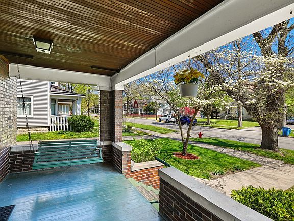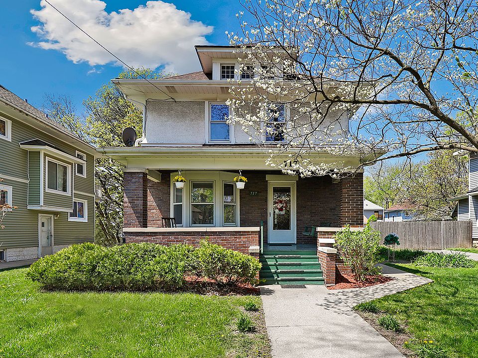 Don't miss this charming American Foursquare in the heart of historic Aurora! An inviting front porch with nostalgic swing welcomes you into the home. Enjoy recent updates along with the preservation of the original hardwood floors, oak woodwork, original doors and hardware, built-in bookcases/storage and leaded glass windows. The main level boasts a spacious floor plan with both living and dining rooms, a sunny kitchen, convenient half bath and bonus 3-season room. Upstairs, you will find 3 generously sized bedrooms, a full bath and easy access to an amazing attic that awaits your finishing ideas! Even more potential living space, storage and laundry can be found in the unfinished basement. Recent improvements include updated electrical 2023, new kitchen countertops 2024, furnace 2014, AC 2009, roof 2016, water heater 2022, appliances 2022 and windows 2008. Outside, enjoy the large patio overlooking the private yard with a detached garage. Great location, just blocks from shopping, dining, parks, schools, transportation and more! Come see today!