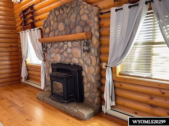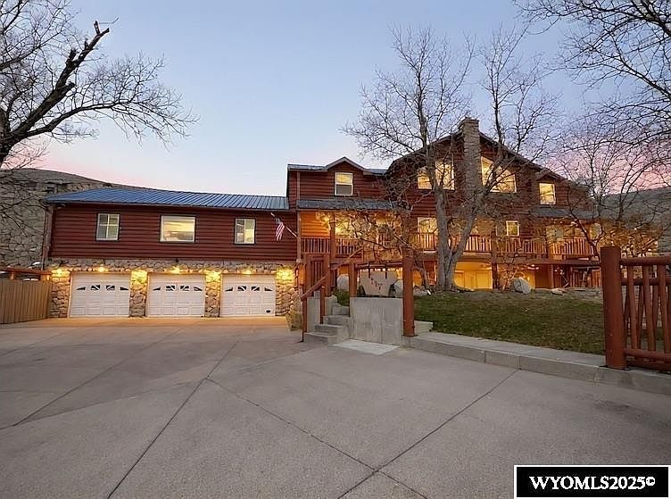 Majestic Custom-Built Log Home! A rare opportunity in Rawlins—country living with all the conveniences of the city! This stunning log home features an open floor plan with soaring vaulted ceilings and a beautifully crafted custom interior. The main level welcomes you into a spacious great room complete with a formal dining area, breakfast bar, casual dining nook, pantry, and two refrigerators for extra storage. A striking river rock fireplace with a pellet stove insert anchors the space, creating the perfect gathering spot. Step directly from the great room into the private backyard featuring multiple decks, a charming bridge leading to the back of the lot, and a peaceful, country-like setting. Just off the great room sits a cozy recreation room with its own pellet stove and walkout access to the deck and hot tub. The main-level primary suite offers a full bathroom, walk-in closet, and French doors opening to the wrap-around private deck overlooking the mature landscaping—your own serene retreat. The upper level features a spacious loft with endless possibilities, plus two additional bedrooms and a full bathroom. The walkout lower level provides exceptional functionality, including two more bedrooms, a full bathroom, an exercise room, office, utility/laundry room, and abundant storage. This level walks out to the oversized three-car garage with plenty of off-street parking. Enjoy spectacular views and a beautifully landscaped yard complete with an underground sprinkler system. Recent upgrades include metal roofing, new gutters, and four propane wall radiant heaters with fans. Propane tank is leased from Blakeman Propane. This is more than a home; it’s an experience. With entertainment and gathering spaces on every level, this custom log home is truly built for family, friends, and memories. Call or text Andrea for your personal tour 307-320-8458. Some photos have been virtually staged to show the potential use of space.