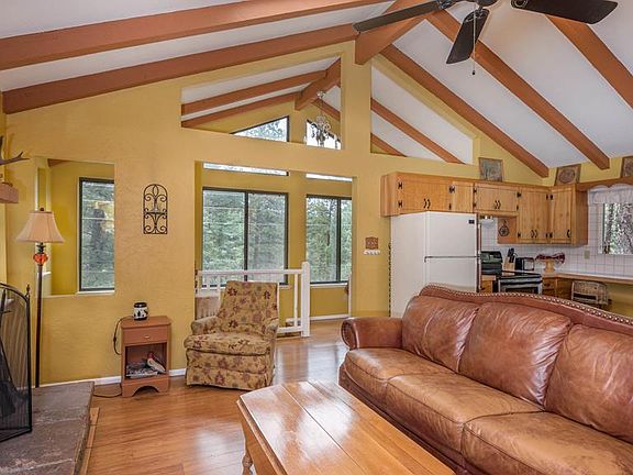 Perfect Cabin get-a-way in the serenity of the "Upper Canyon". This open concept 3 bdrm / 2 bath cabin has vaulted ceilings & wall to wall windows showcasing the forest views. The private master suite with full bath is on entry level with french doors leading outdoors Many great updates incl. enclose staircase leading upstairs, addition of the atrium style dining nook to enjoy that first cup of coffee. The full kitchen with side bar is open to the living area that showcases the brick fireplace, perfect for those chilly nights. Step out onto your private deck to soak in the Hot Tub then sip on something while you relax by the fire table. This cabin has it all and is a great rental!