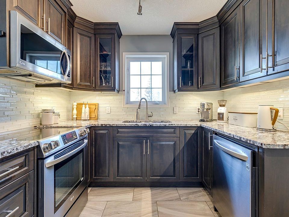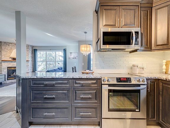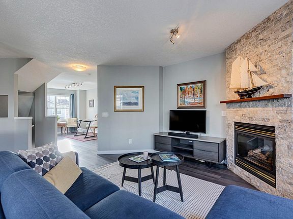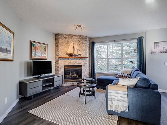 Luxury living in the desirable Quinterra complex on Calgary's posh west side! Enjoy a beautifully designed and landscaped townhome complex with a water feature that greets you as you enter and mature trees throughout. The complex is pet-friendly with plenty of visitor parking and your own attached garage! One of the rare RENOVATED units in this complex, you can enjoy a spectacular kitchen with granite counters, custom cabinetry, stainless steel appliances, under-cabinet lighting and an adjacent laundry/pantry with amazing storage! The dining area is next to the private balcony, perfect for morning coffees and evening BBQs! Enjoy winter nights cozied up in the living room with gas fireplace and views of the trees outside (not a fishbowl of other units like many newer complexes!). Sunny SE-facing den on this level is an amazing home office or could be set up as a lovely music room, yoga space, library, play area, second living room or more. Upstairs, the primary suite is stunning with walk-in closet, additional wall-to-wall wardrobe and luxurious 5-piece ensuite bath with an abundance of storage. Sunny 2nd bedroom is generously sized. Being an end unit gives windows on multiple sides of this home and there is great light throughout! The entry level has a coat closet and direct garage access and the full-length driveway is perfect for a second vehicle. Quick access to all of the shops and restaurants of 85 Street West like Mercato, Blanco Cantina, Una Pizza, brunch spots, sushi, Deville Coffee and much more. Drive downtown in just 15 easy minutes. Drive west to the mountains or enjoy access to nature at nearby Paskapoo Slopes or Edworthy Park. Please note the condo fees INCLUDE HEAT, WATER & SEWER (rare for townhomes) and the heating is in-floor on all levels so it's super cozy and efficient!