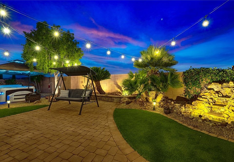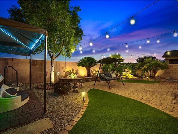 **Immaculate One Story Home with Oasis-Like Backyard!!** This stunning home impresses, but the backyard truly shines! A large patio and shaded cover create the perfect spot to relax or entertain year-round. Easy-care landscaping with irrigation timers, pavers, and artificial turf adds both beauty and simplicity. Unwind in the hot tub beneath its own shade cover. Inside, a spacious open floorplan connects the kitchen and living room. The kitchen features quartz counters, custom soft-close cabinets with slide-outs, and an island with storage. Stainless Appliances included. Washer and Dryer also included! A water softener system is installed and works great. The primary suite offers a walk-in closet with organizer, dual sinks, and shower. Quality shutters on all windows and sliders plus ceiling fans in every room keep the home cool and energy efficient. Tile flooring throughout makes cleaning a breeze. Located in Mountains Edge, just moments from parks and all conveniences! Must see!
