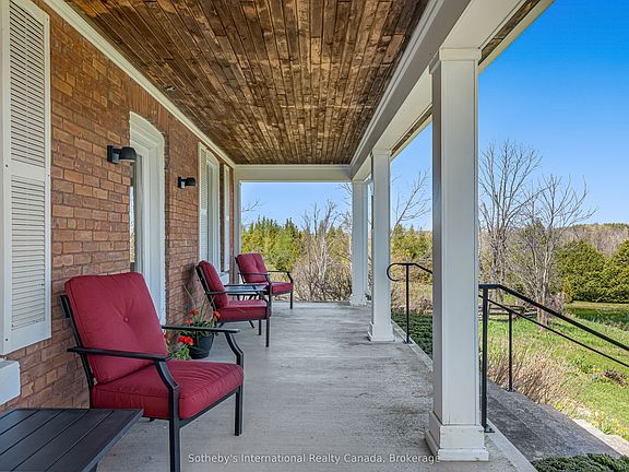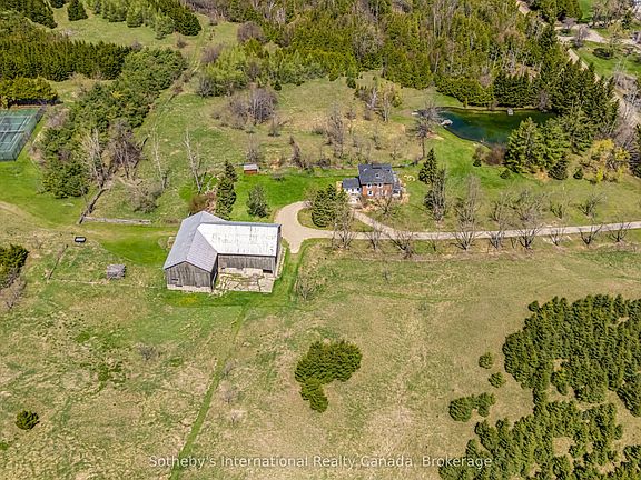 Escape to the rolling hills of Mulmur and discover this beautifully preserved three-storey brick farmhouse set on 88 acres of pristine countryside and wonderful private walking trails through pastures and forests. Rich in character and lovingly maintained, the home exudes warmth and timeless charm offering a rare opportunity to embrace the very best of country living. Enter through the welcoming front veranda or opt for the side foyer with direct access from the driveway. The main floor is filled with natural light and features a spacious living room with original wood trim and a cozy wood-burning fireplace, a formal dining room with hardwood floors and tranquil pond views, and an upgraded kitchen with stainless steel appliances. A powder room, full four-piece bath, and laundry room add comfort and convenience. Upstairs, four bright bedrooms share another four-piece bath. The third floor unveils a sunlit open loft with cathedral ceiling, its own bathroom, and endless versatility ideal as a fifth bedroom, home office, art studio, or serene yoga retreat. The natural surroundings are truly exceptional, with sweeping vistas, a spring-fed pond ideal for swimming, and private trails winding through mature forests. Approximately 50,000 trees have been thoughtfully planted, enhancing the property's privacy and year-round appeal. Outdoor highlights include a large classic bank barn, tennis court, and ample open space for recreation or relaxation. A long driveway leads to a circular drive with parking for 15+ vehicles perfect for hosting gatherings. Tucked away on a quiet country road with breathtaking views and unmatched seclusion, this exceptional property is just minutes from Mansfield Ski Club, Mono Cliffs Provincial Park, the Bruce Trail, 20 minutes to Mad River Golf, Devil's Glen ski and the charming village of Creemore.
