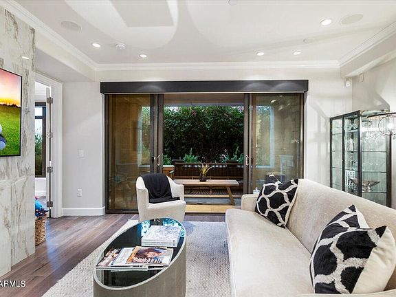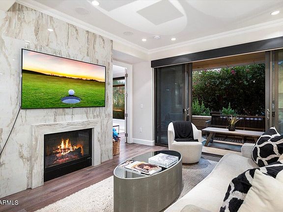 Set within the Scottsdale Waterfront Residences, this rare ground-floor end unit overlooks the canal and enjoys a uniquely private setting created by mature, thoughtfully grown flora. The split layout features two ensuite bedrooms on opposite wings, along with a powder room for flexibility and a walk-in pantry for additional storage needs. The open living area is enhanced by crown molding, designer lighting, and a custom fireplace wall. The chef's kitchen is appointed with Viking appliances, a gas cooktop, built-in refrigerator, and generous cabinetry, flowing naturally to the private patio through sliding glass doors. Additional highlights include two secure garage spaces and a large dedicated storage room. Amenities encompass 24-hour security and concierge, valet service, a rooftop pool and spa, fitness center, wine cellar, and resident club roomall within steps of Scottsdale's premier shopping, dining, and cultural attractions.