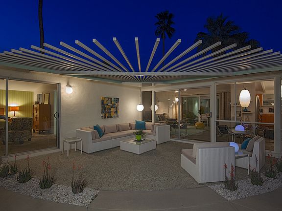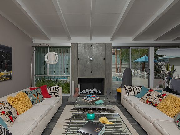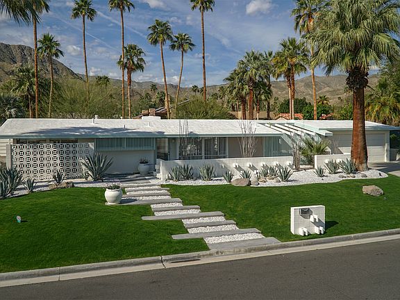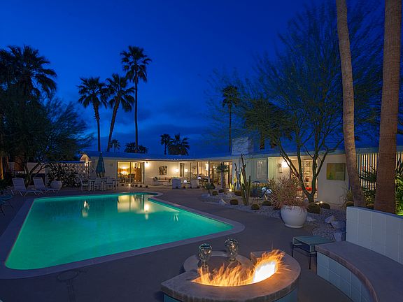 The most beautiful and unique in the area this post and beam mid century property is a must see to truly feel the ambiance of the time period. One of the most beautiful 3 bedroom 2 bath completely remodeled and beautifully decorated! Updated kitchen with top of the line stainless appliances, quartz counters and upgraded modern cabinets. Slate floors throughout. Master is ensuite and large with beautiful mountain and pool views. Large updated bathroom with dual sinks, oversized tiled shower for 2 and dual water closets. Two very large closets complete the suite. The 2 guest bedrooms are absolutely adorable! One has front facing views and one has pool and mountain views. Large guest bathroom with impressive tiled shower and quartz counters. The crystal clear sparkling large pool is completely redone. The park like backyard is generously landscaped and serene with magnificent mountain views. Al fresco cozy courtyard for dining and a bubbling hot tub completes your entertaining pleasure!