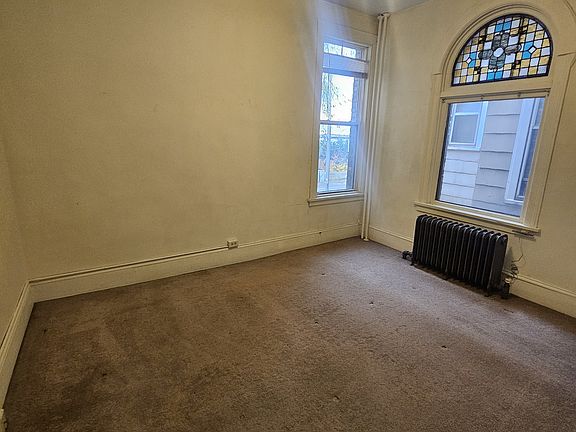 This 1st floor apartment features a huge living room with stain glass windows, decorative fireplace, and lots of kitchen cabinets!