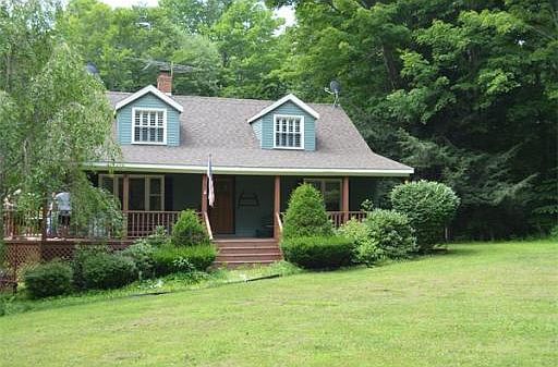 Country home nestled on 3.5 acres in the foothills of the Berkshires. Come down the curved driveway and immediately note the large, expansive covered front porch, perfect for relaxing on rockers or simply sitting on a swing enjoying the sounds of the birds and the natural beauty all around on the private, level, partially wooded lot. Home offers abundant sunlight with large sliders off kitchen to spacious deck and plenty of windows in bedroom dormers. All hardwood floors, tiled kitchen floor, pantry, granite counters, 4 large bedrooms, 3 full baths, new carpet and open floor plan. Optional heat with wood stove, large lower level ready to finish, wrap around open deck and large one-car garage. Pretty landscaping under snow! Perfect for full or part time living and close to all the Berkshires has to offer - culture, recreation (fishing/boating/skiing/hiking), shopping not to mention LOW taxes in the quaint town of Tolland. It doesn't get much better than this at an incredible price.