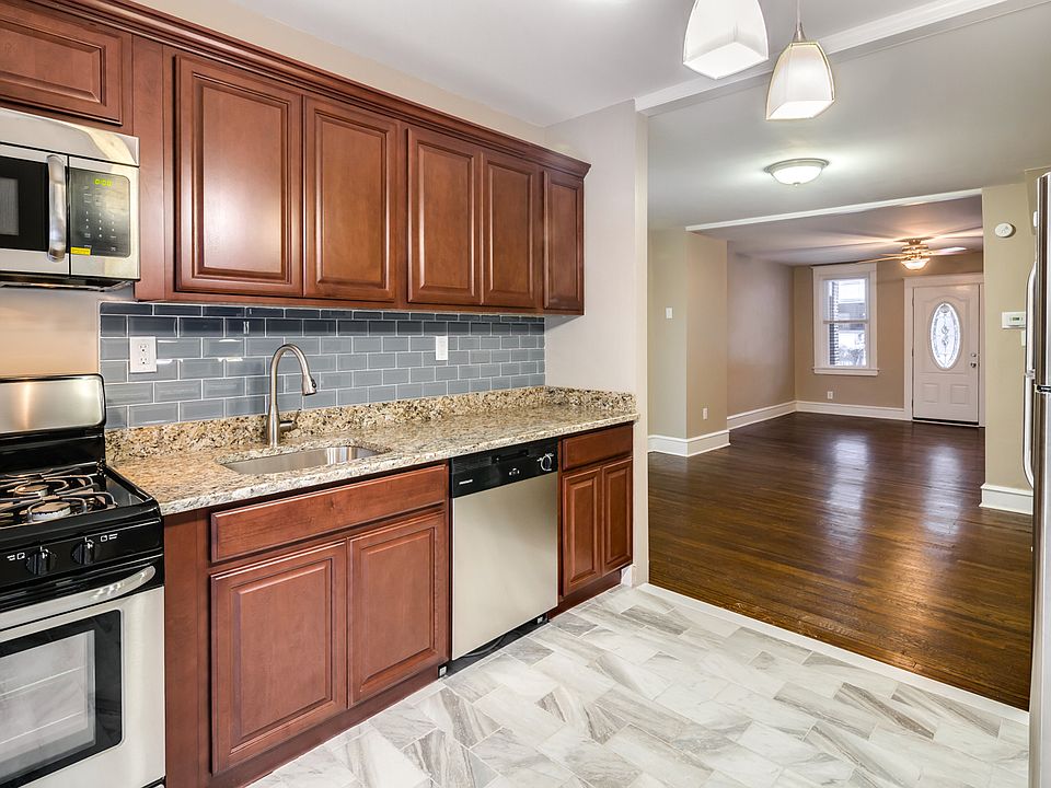 Welcome to your newly renovated 3 bedroom home! Enjoy the first floor open floor plan, with hardwood floors, and featuring a light-filled, low-maintenance kitchen, finished with stainless steel appliances, glass tile backsplash, gas stove, tasteful contemporary lighting, and updated fixtures. The sliding glass doors lead out to a spacious outdoor covered deck for entertaining, or just relaxing with your morning cup of coffee/tea. The second floor bedrooms are well-sized, newly carpeted, with good closet space. The bathroom has a clean, fresh look, is accented in contrasting glass tile trim and is well-appointed with a wide vanity/sink, brushed aluminum lighting, and a storage/linen closet. The basement offers a powder room and ample storage space,as well as a side room which can be used as a workroom or for more storage. There is an attached one-car parking garage located in the rear of the house, as well as a driveway to accommodate a second car. Turnkey and Move-in ready!
