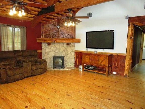 Great home with wood floors in the living and breakfast. Log construction inside with beamed and vaulted ceilings. Rock wall for wood stove. Just needs installation of chimney flue. Breakfast bar with tile counter tops. Large master bedroom with unique garden tub and shower. Lots of room in the master closet with built ins. Wrap around porch on two sides. Storage building and three bay workshop with approx 1400 sq'. Home needs some TLC and has lots of potential for a beautiful home.