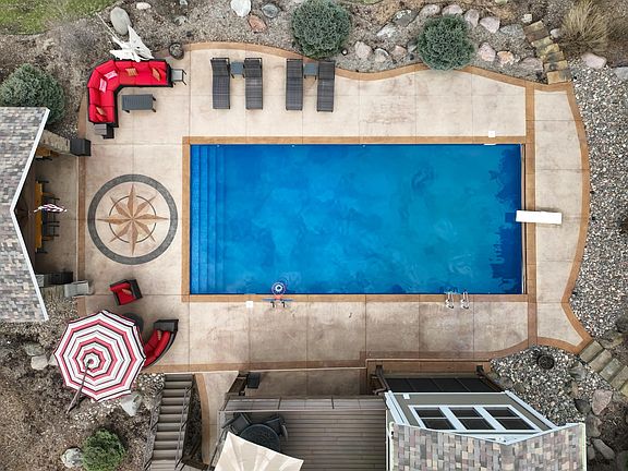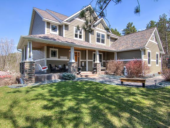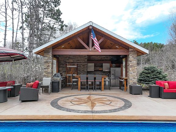 A front porch swing in a dappled shaded summer night! This is the perfect approach to this luxury level home that awaits you. A quiet, tucked away and private setting surrounded by pine woods and beautiful stone landscaping. Inside, the large, spacious floor plan lends to an open & airy kitchen, generous informal dining, plus a very welcoming, cozy living room. Main floor sun room looks out over the beautiful backyard and has access to the upper deck. This is a great set up for small or large gatherings! The main level is set up perfectly for a home office right off the two story vaulted entry, full of natural lighting. The upper level has the primary ensuite rooms at one end of the hall and three additional bedrooms at the other. The lower level walkout is replete with ways to have your family & friends enjoy time together. A media area with screen & projector, a serving bar/kitchen, bar counter dining, 3-season porch, and a dedicated exercise room. The summer months are the best here with a 20x42 salt water pool! Set in a beautifully landscaped yard, serve meals off the grill in the custom DeVine Designed open-air outdoor kitchen. All the kitchen appliances needed to entertain and relax including a gas grill , fridge, dishwasher and more. There's the bar style eating area under the vaulted roof plus a 3/4 bath, washer/dryer and storage room. In the evenings roast s'mores at the fire ring beside the outdoor kitchen. This home is the ultimate in entertainment & enjoyment and the place to gather family and friends!