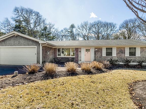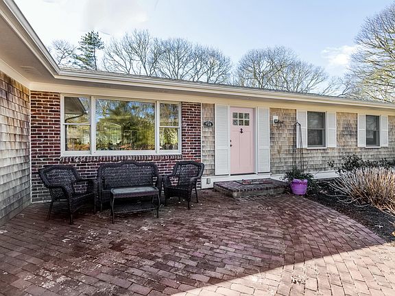 Well appointed one-story living in Riverbay Estates on .47 acre lot. Beautifully updated 2-bed, 2.5-bath cape ranch features an open-concept living, dining, and kitchen area filled with natural light. The modern kitchen boasts a spacious island, engineered quartz countertops and stainless steel appliances. The large primary suite offers a walk-in closet and an updated ensuite with a deep Kohler soaking tub and tiled shower. There is a mudroom off the kitchen with first-floor laundry. Also steps from the kitchen is a custom travertine and stone patio with a fireplace, work counter and outdoor sink--perfect for entertaining. A custom-finished basement with half bath is ideal for gatherings. Additional perks include gas heat, AC, hardwood floors, and an attached garage. Nestled in a charming 285-acre neighborhood with curved streets and access to two Kettle Ponds, this move-in-ready home is a rare find!