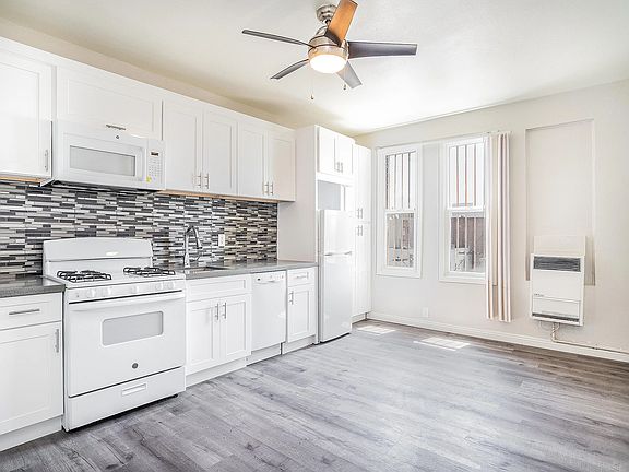 Solid brick buildingTile and wood flooringCeiling fanGas stoveVertical blinds